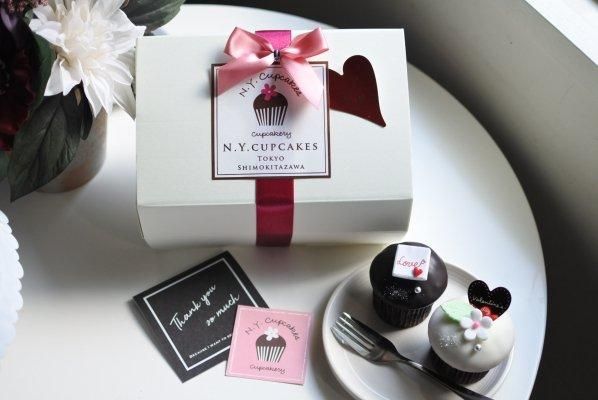 テイストは2種。ブラックとホワイトチョコレートがけのカップケーキを各半数ずつお入れしております。