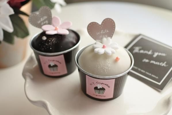 芳醇な香りと口どけのホワイトチョコレート ディップ カップケーキ2個と、ホワイトデー限定デザインのクリームカップケーキ4個、計6個入りのカップケーキセットです。