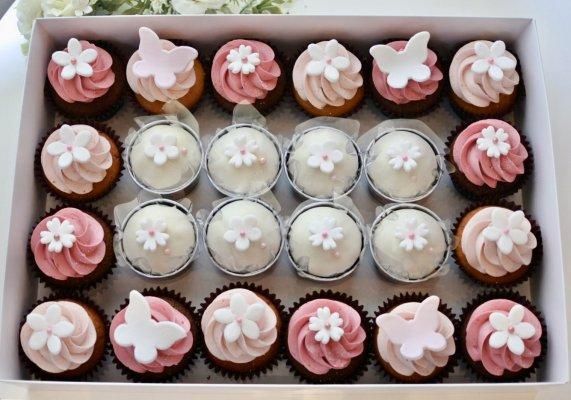 クリームカップケーキとチョコレートがけのカップケーキ、両方を楽しめる24個入りのホワイトデー限定カップケーキセットです。