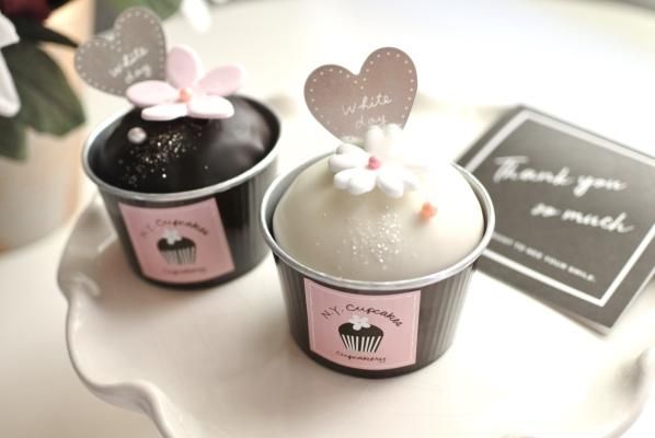 焼き立てのカップケーキを、芳醇な香りと口どけのチョコレートでディップした常温タイプのカップケーキ。紙袋から取り出すとケーキが見えるエレガントなボックスにお入れして、リボンをおかけしました。