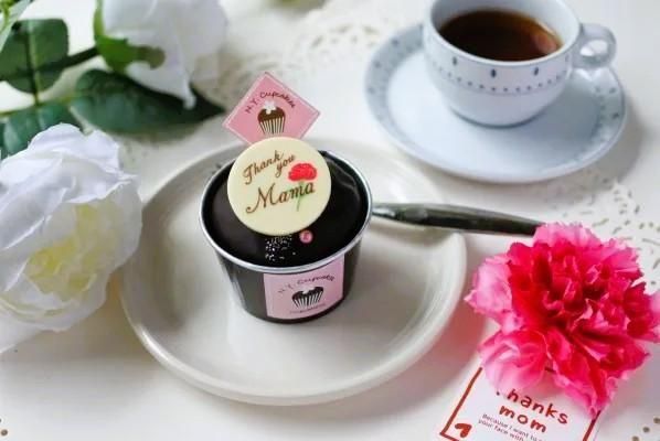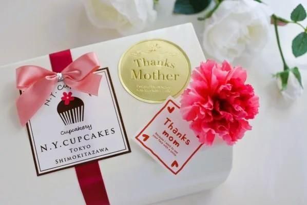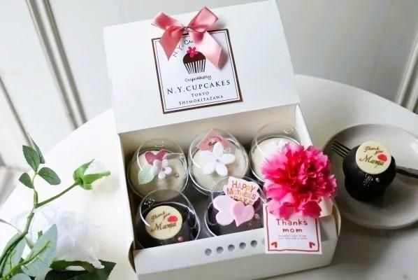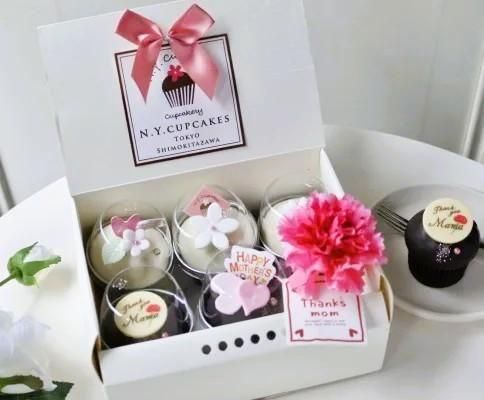 常温で保存できるギフトに人気のカップケーキ。カーネーション(造花)を添えた母の日限定のボックスです。5個入りと7個入りの2種類をご用意いたしました。どちらかお選びください。